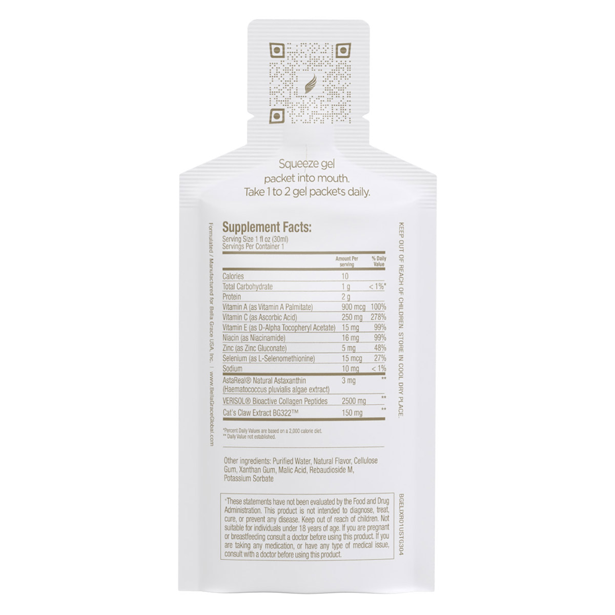 This unique focus of Bella Grace, the triple benefits of Verisol® Bioactive Collagen Peptides combined with AstaReal® astaxanthin and the botanical treasure, Cat’s claw is what sets Bella Grace Elixir apart. This exclusive formula approaches beauty from within from the perspective of superior science, with the best ingredients available that work in synergy to give you optimal skin health.